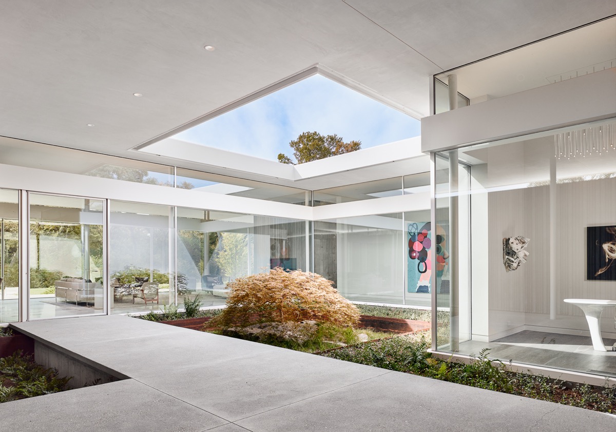 Las puertas acristaladas de borde a borde maximizan las vistas a un patio arbolado.