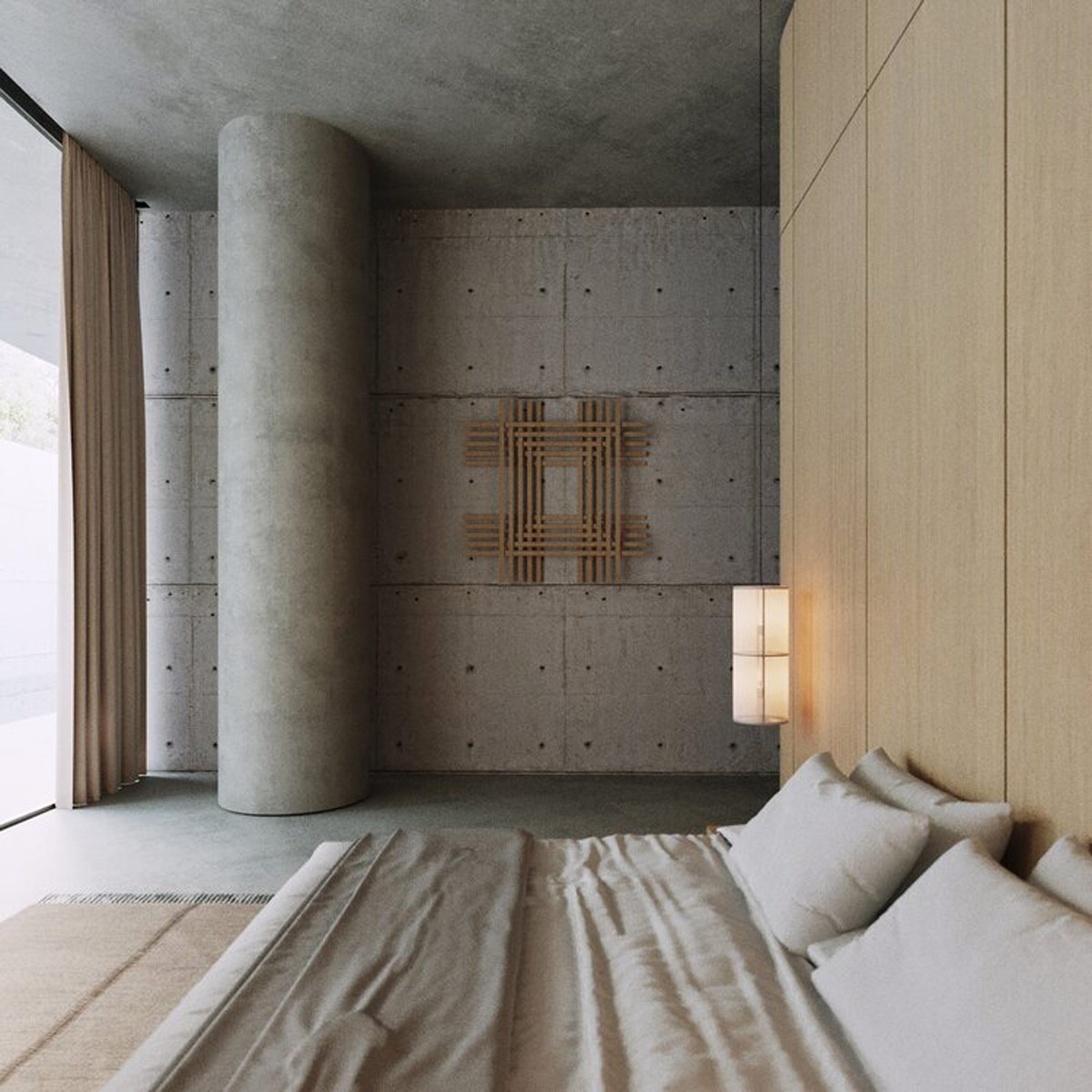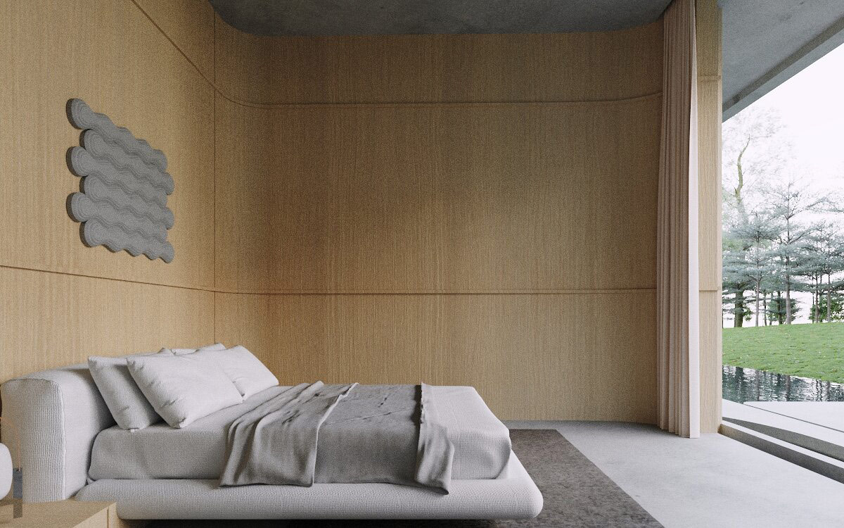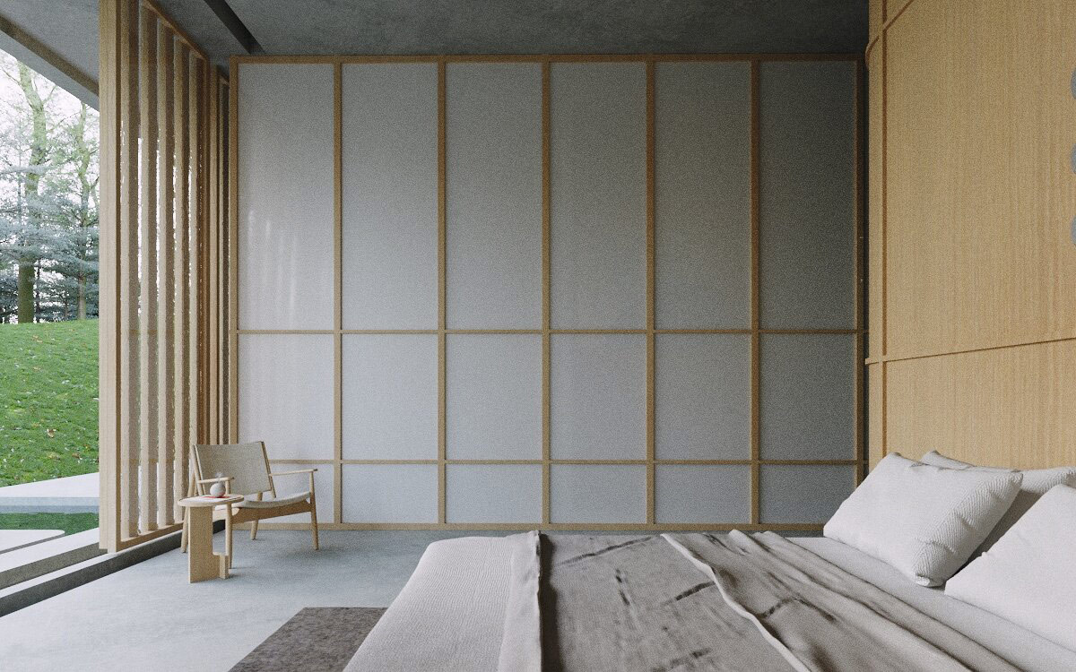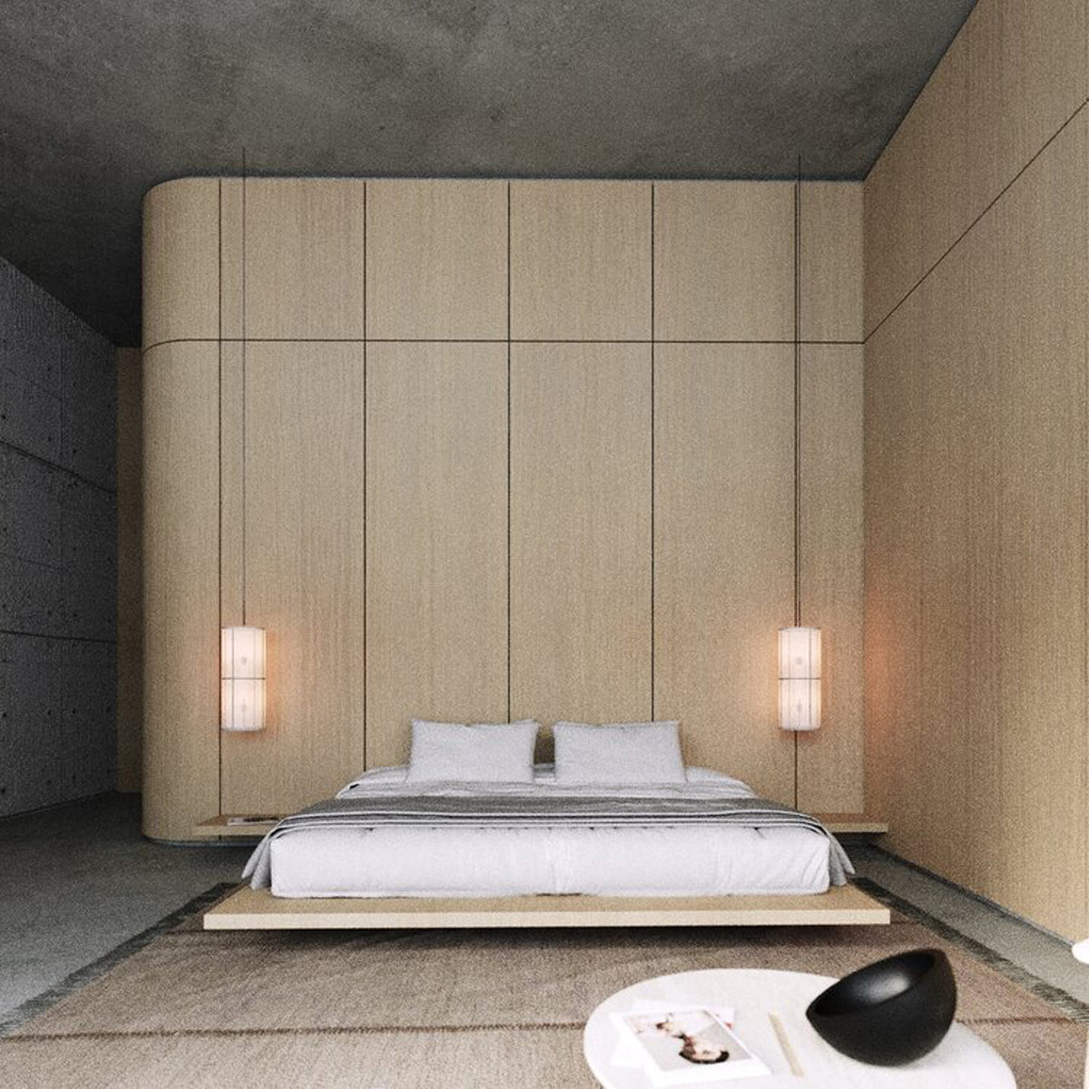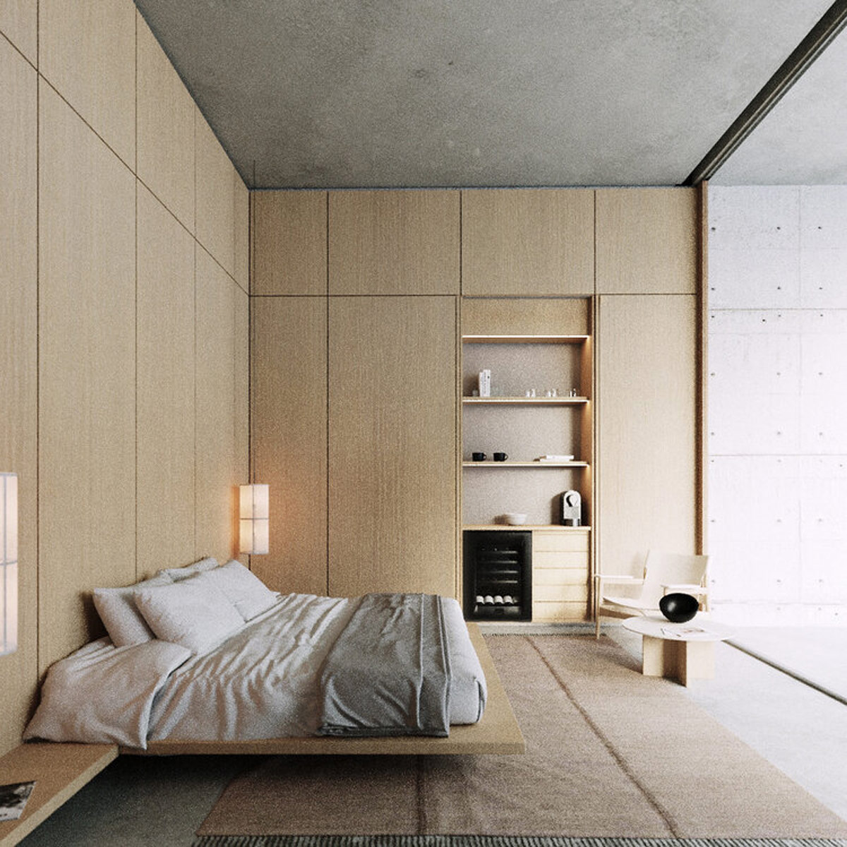 Los diseños de los dormitorios siguen la misma línea de cálida decoración revestida de madera y tranquilo minimalismo. Las camas de plataforma de estilo japonés y las mesillas de noche contemporáneas se apoyan en el suelo.