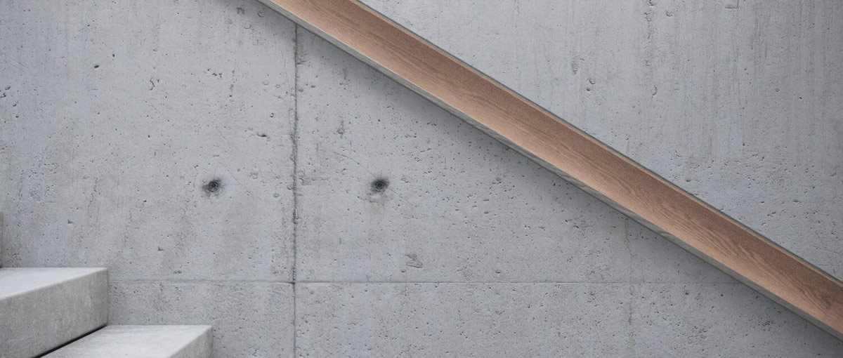 Una imponente columna de hormigón resulta irresistiblemente táctil. El arte mural en madera añade una complejidad contradictoria.