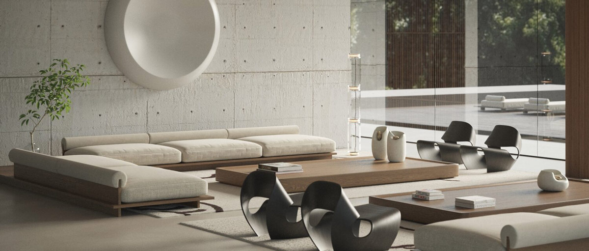 Al apartar los ojos de la gloriosa vista, nos encontramos con un salón contemporáneo de paredes de hormigón con una elegante delicadeza japonesa moderna.