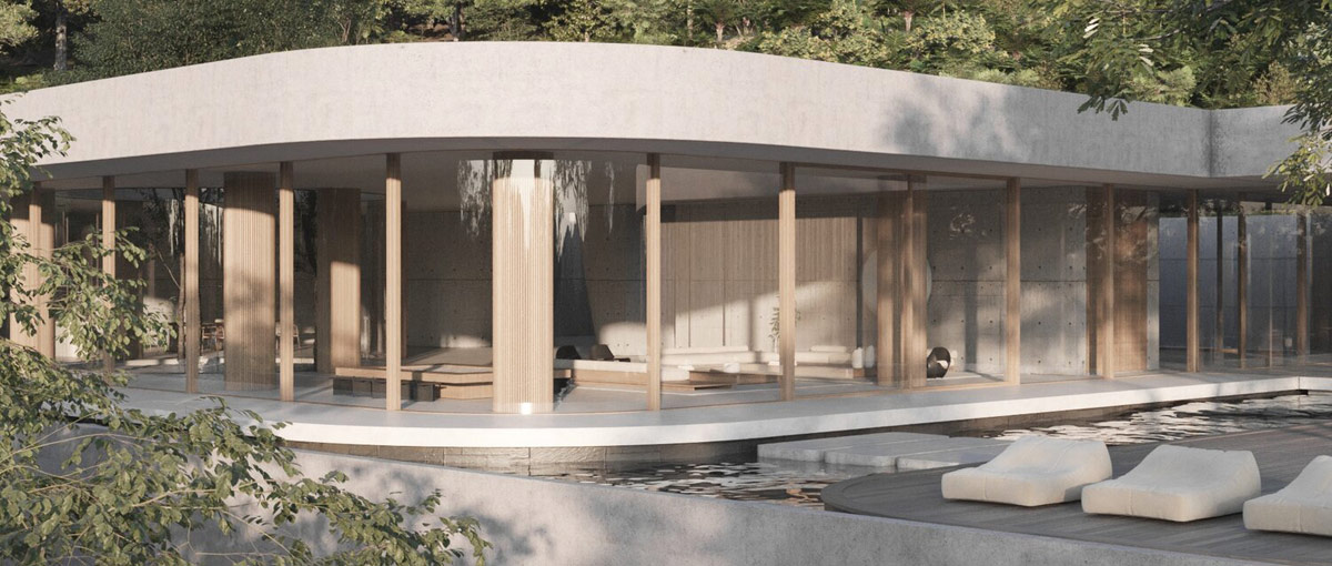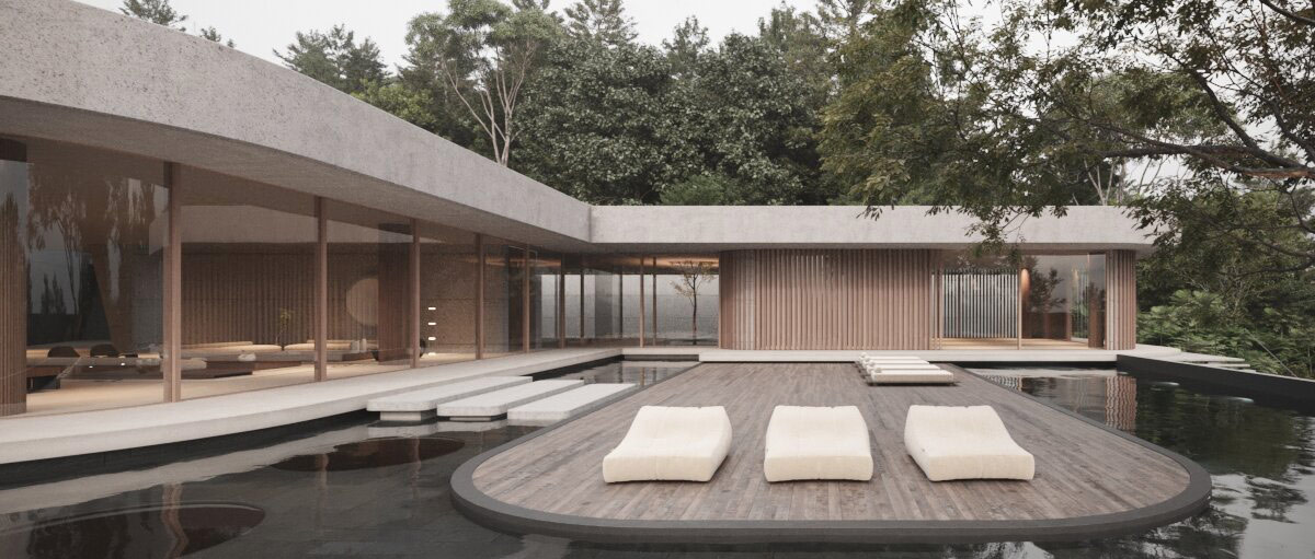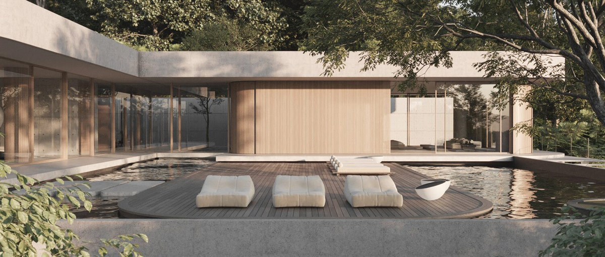 Las vetas de la madera natural, las grandes extensiones de agua y los majestuosos árboles se unen para crear tranquilos encuentros zen a través de encantadores espacios exteriores, de los que hay un equilibrio igual en las terrazas del primer y segundo piso.