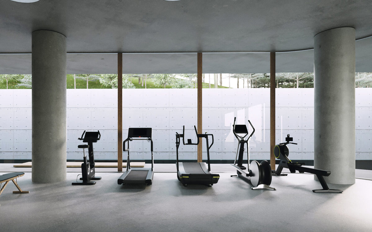 Varios aparatos de gimnasia se alinean a lo largo de la pared de la ventana, mientras que en la parte trasera hay colchonetas para trabajar en el suelo.