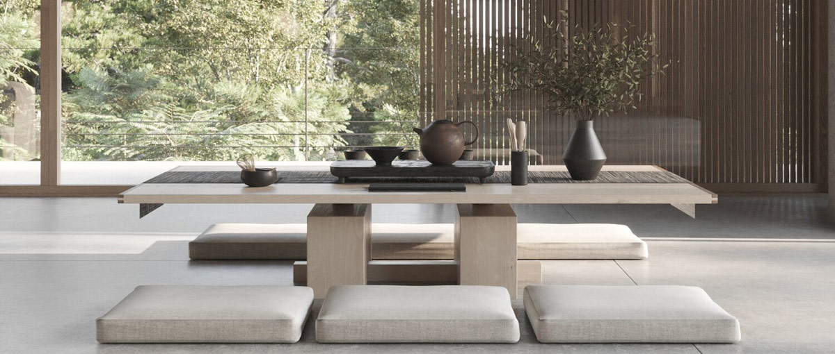 Cojines de zabuton se alinean en una moderna mesa chabudai, donde una singular tetera espera para servir.