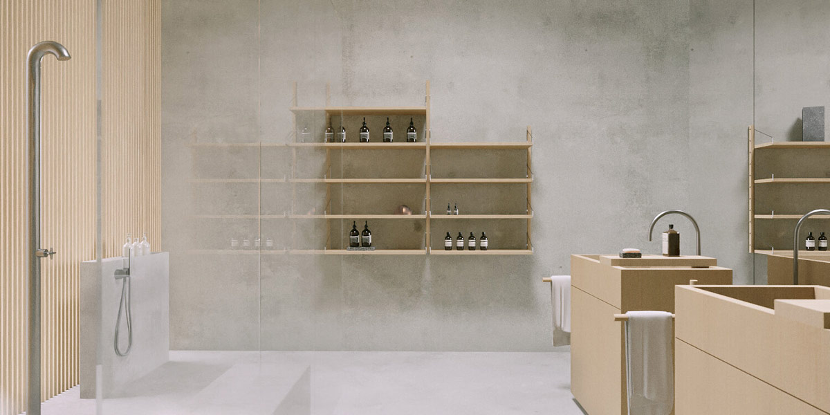 Duchas minimalistas gemelas brotan como simples grifos de pie.