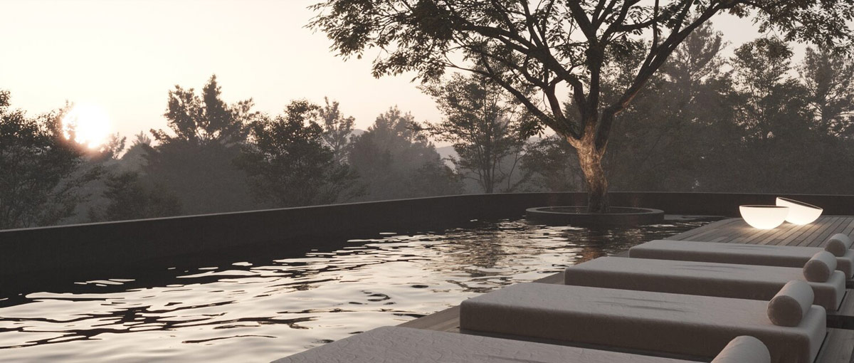 La madera natural, el agua y el majestuoso árbol se unen para crear una experiencia zen que sosiega la mente, el cuerpo y el alma.