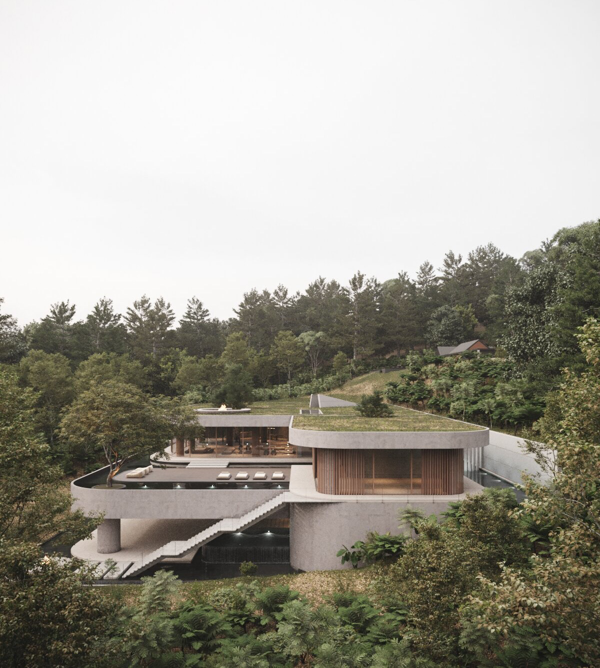 Situada en Llanogrande, Colombia, 5 Solidos arquitectos han diseñado esta imponente casa en la selva para incorporar el tranquilo ethos japonés. La forma de la casa se suaviza por dentro y por fuera con esquinas curvas que facilitan un flujo pacífico.