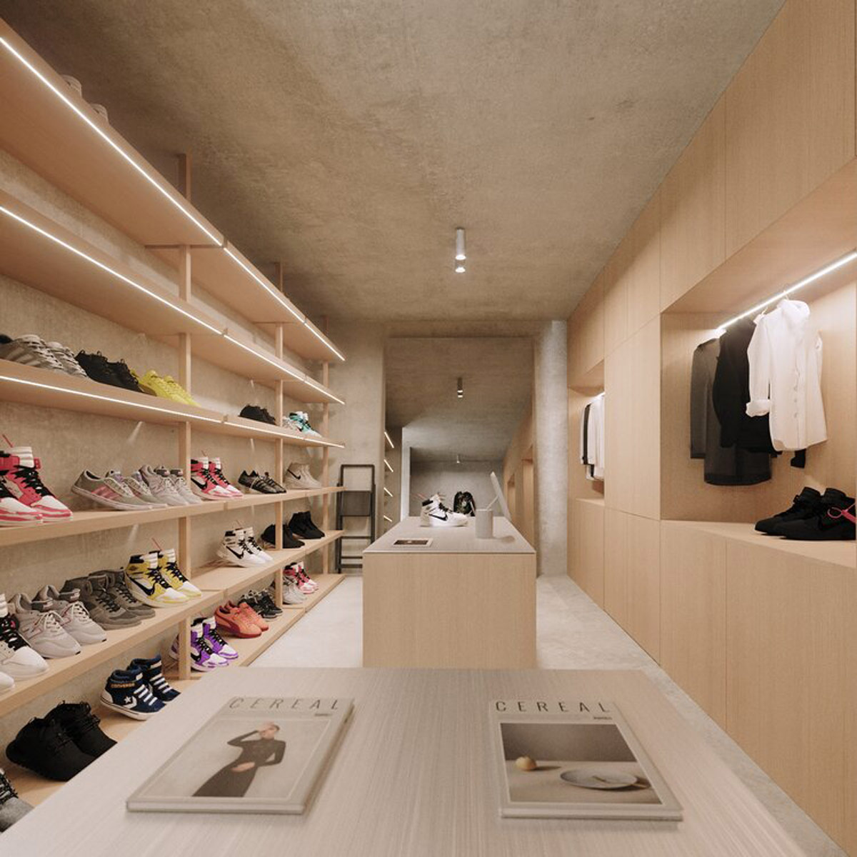 El suelo y las paredes de listones de madera envuelven cálidamente la sala, mientras que el hormigón pálido ilumina la mitad superior.