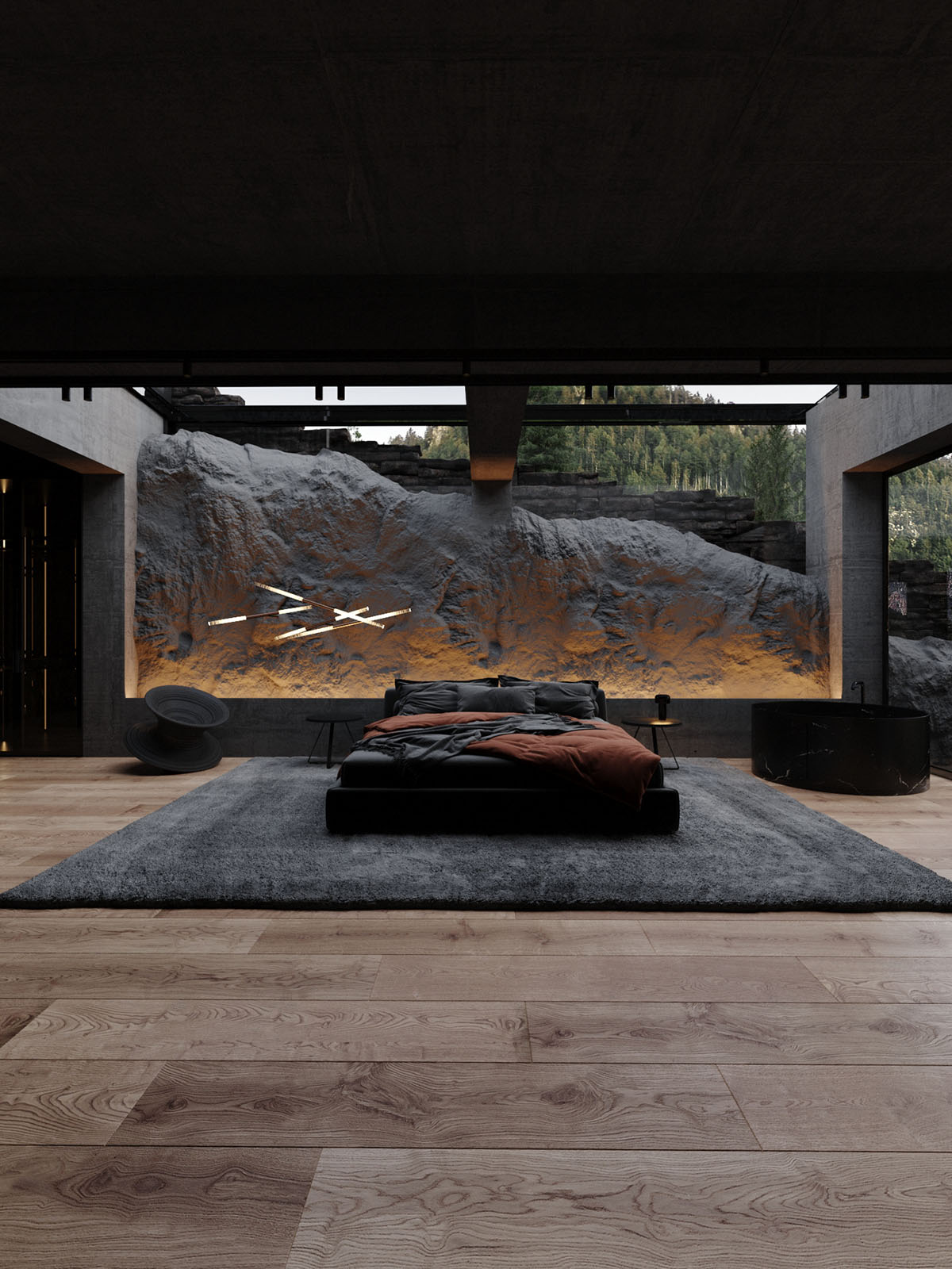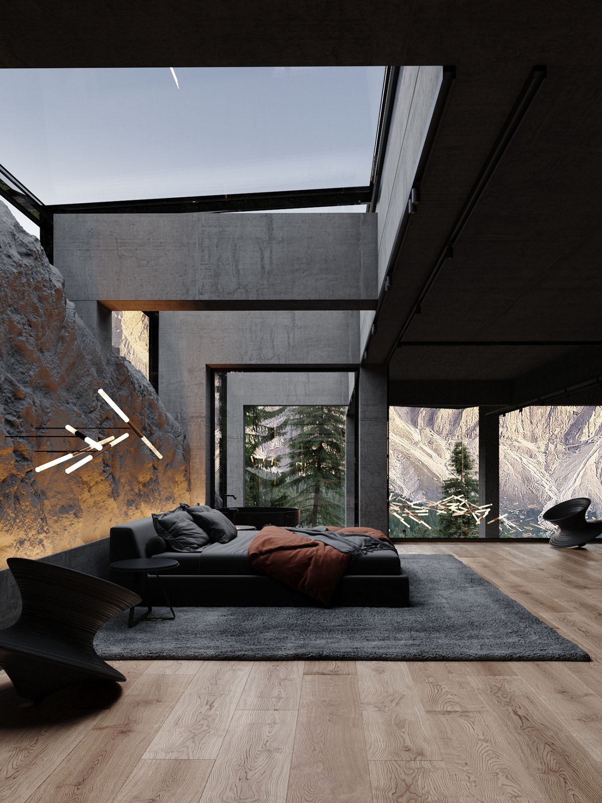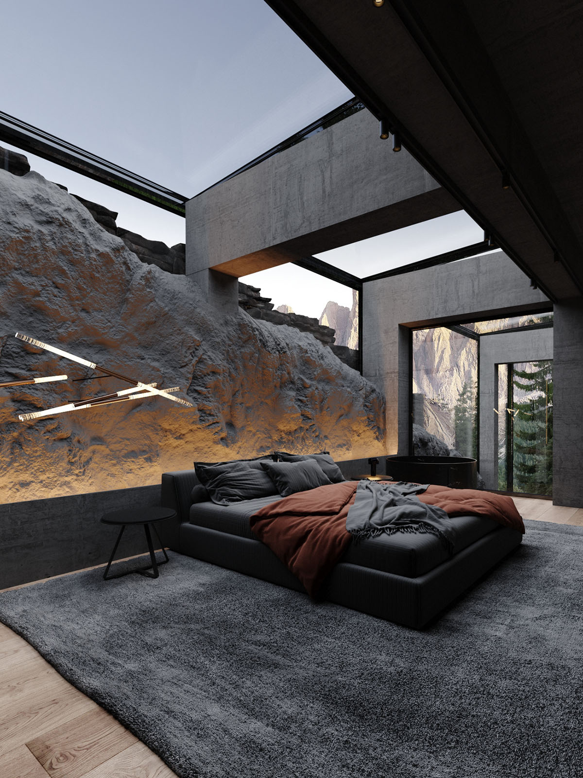 Diseñada por el arquitecto Stephen Tsymbaliuk, la casa presenta un interior espacioso y lujoso con un exuberante patio interior y amplios tragaluces. Los dormitorios son de otro mundo, con techos de cristal para que todos puedan dormir bajo las estrellas. Un garaje subterráneo se adentra en la montaña como si fuera la entrada a la Batcueva. Unos arcos de LED iluminan la espectacular entrada.