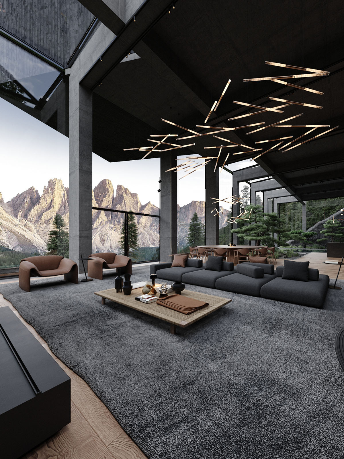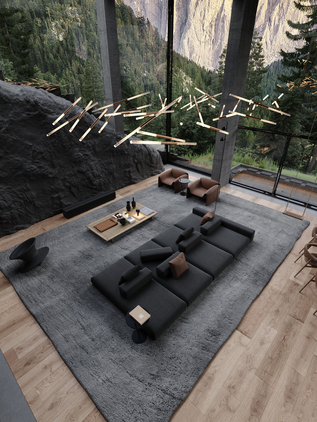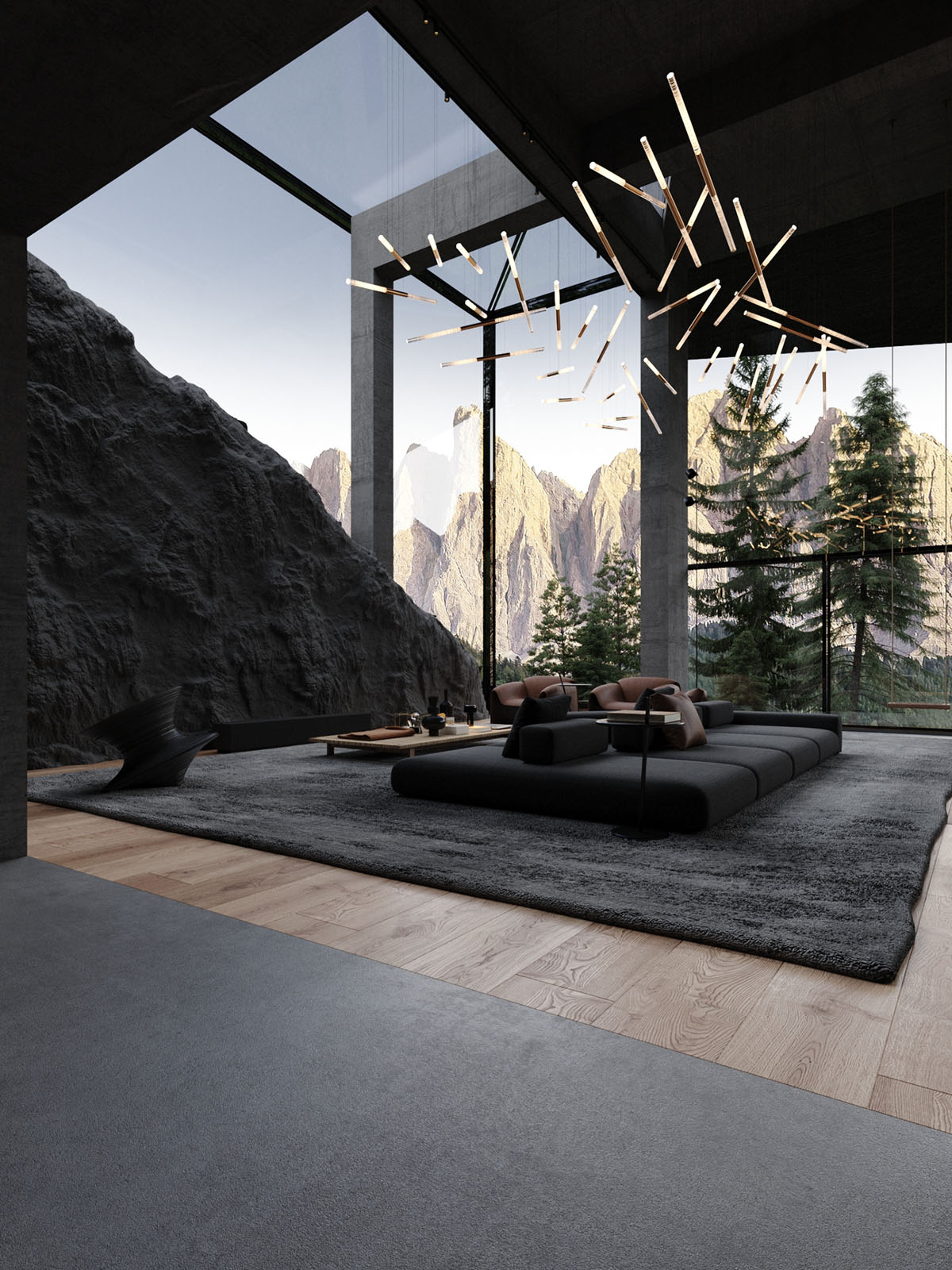 En el interior de la casa, un amplio espacio de estar está decorado en tonos oscuros, lo que permite que la épica vista mantenga la debida atención. Una gran alfombra de salón negra define una cómoda zona de estar, donde el mobiliario es mínimo pero de gran estilo.