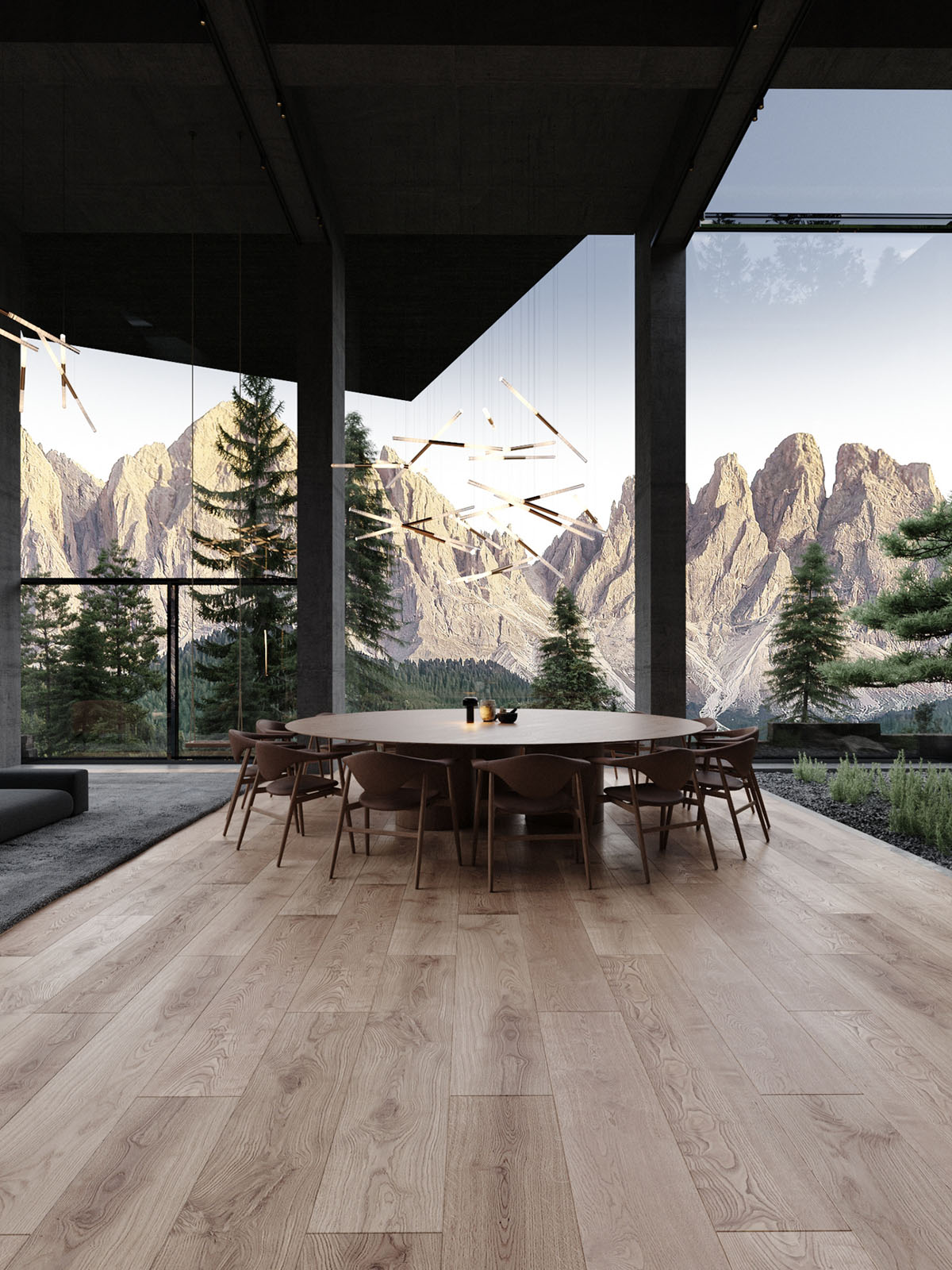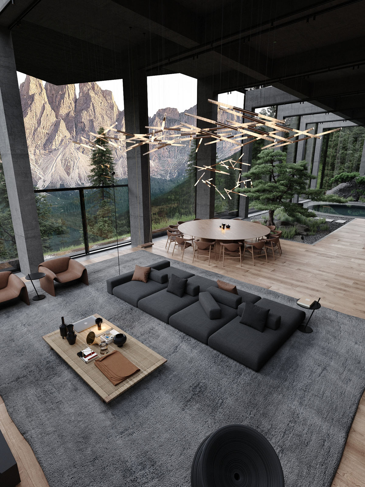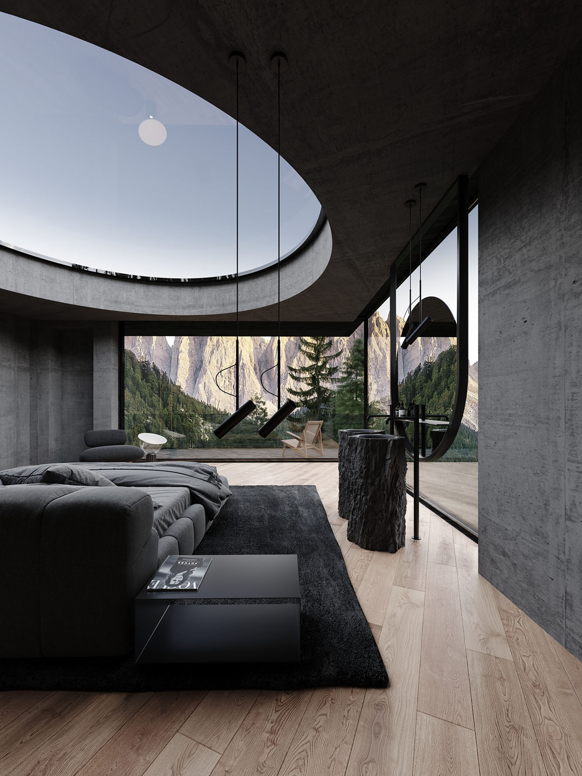 En el interior de la casa, un amplio espacio de estar está decorado en tonos oscuros, lo que permite que la épica vista mantenga la debida atención. Una gran alfombra de salón negra define una cómoda zona de estar, donde el mobiliario es mínimo pero de gran estilo.
