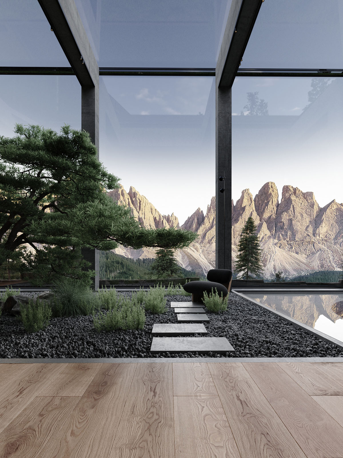 Unos escalones permiten al propietario adentrarse en el patio de grava.