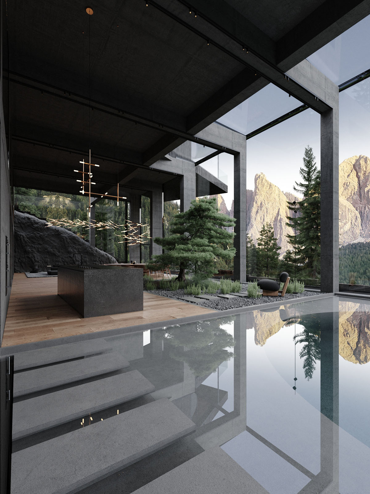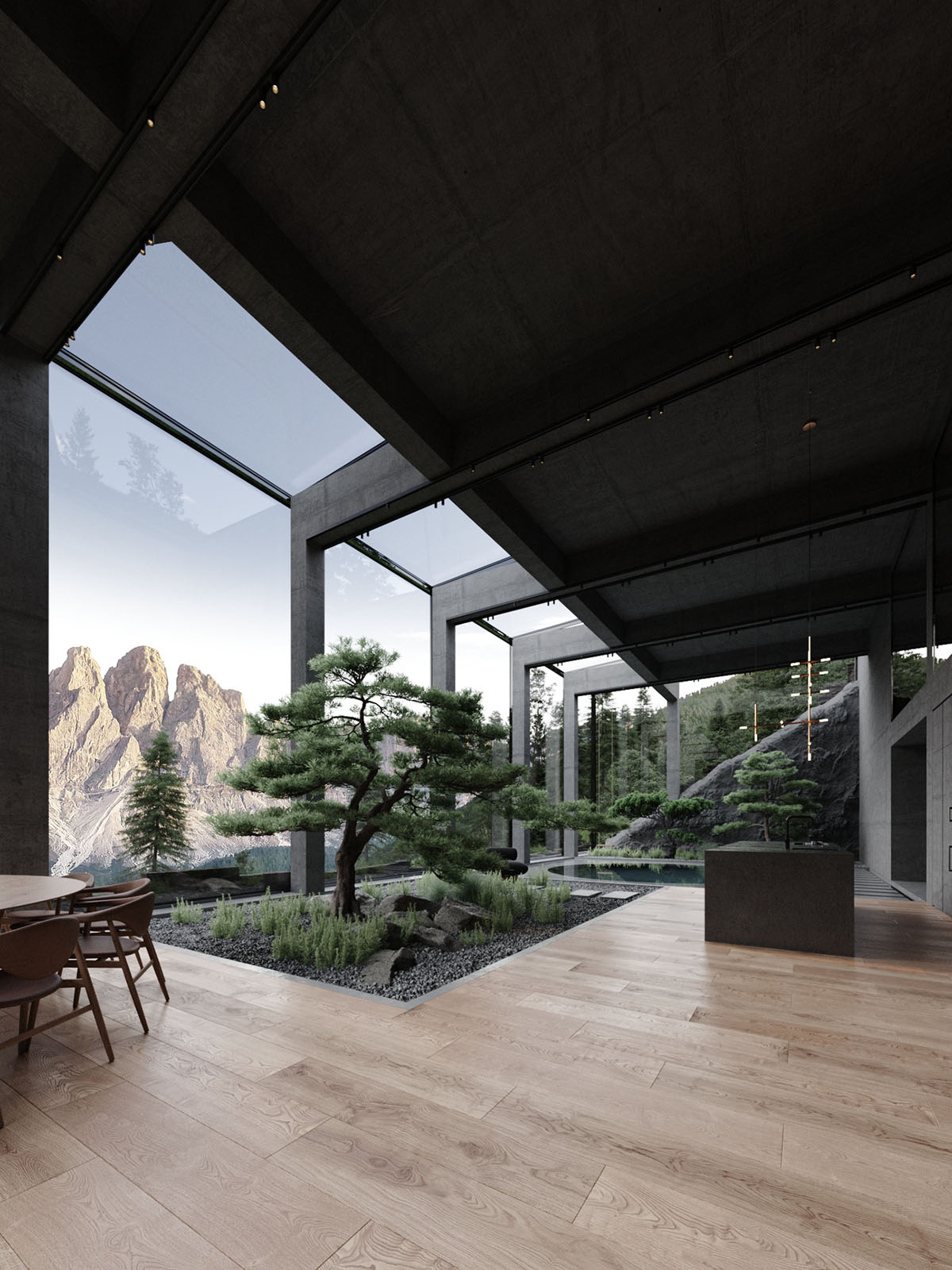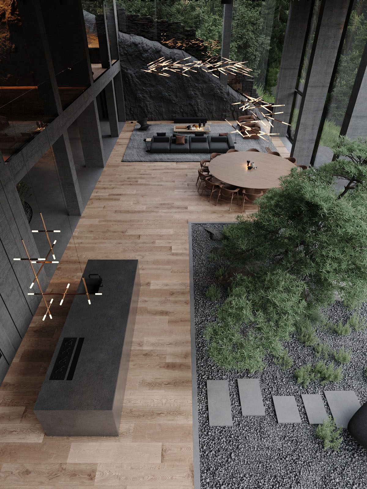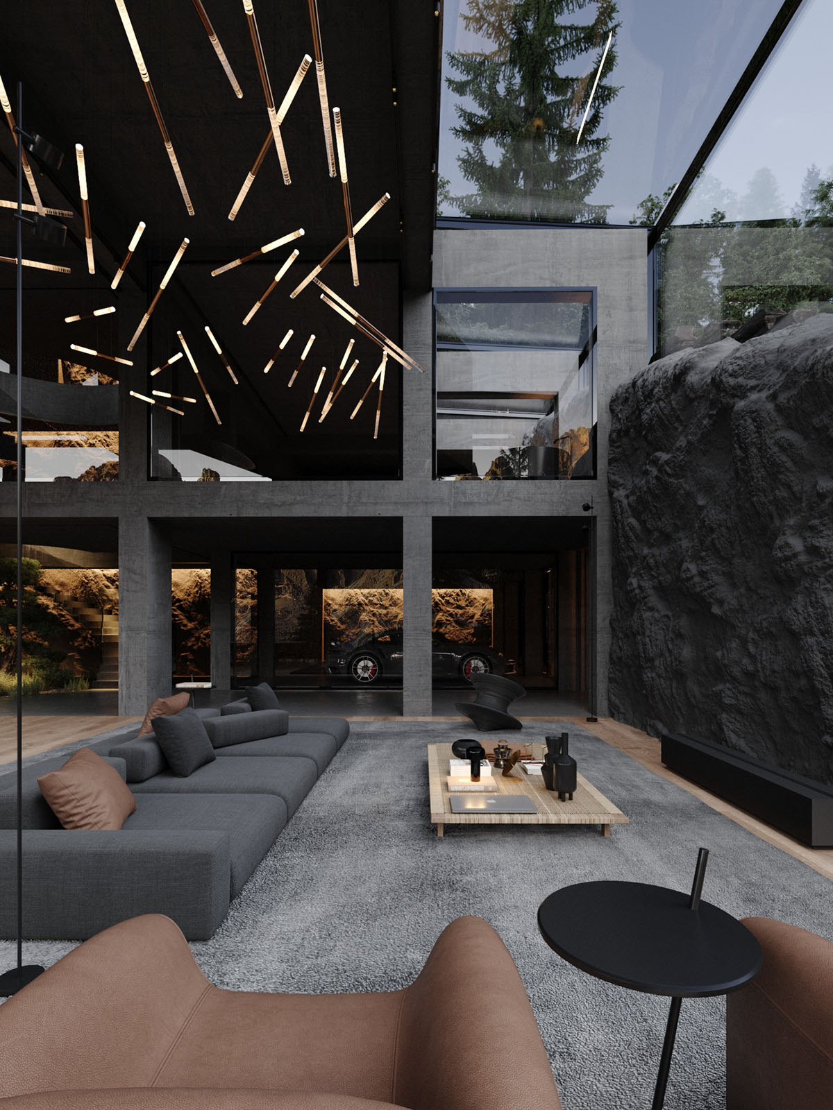 Las copas de los árboles se elevan sobre las claraboyas, añadiendo movimiento y color a la casa. La montaña rocosa forma una extraordinaria pared focal en el salón. El garaje se ve desde el salón principal, metido en la roca por la que se entierra.