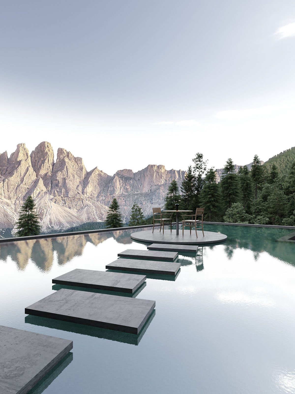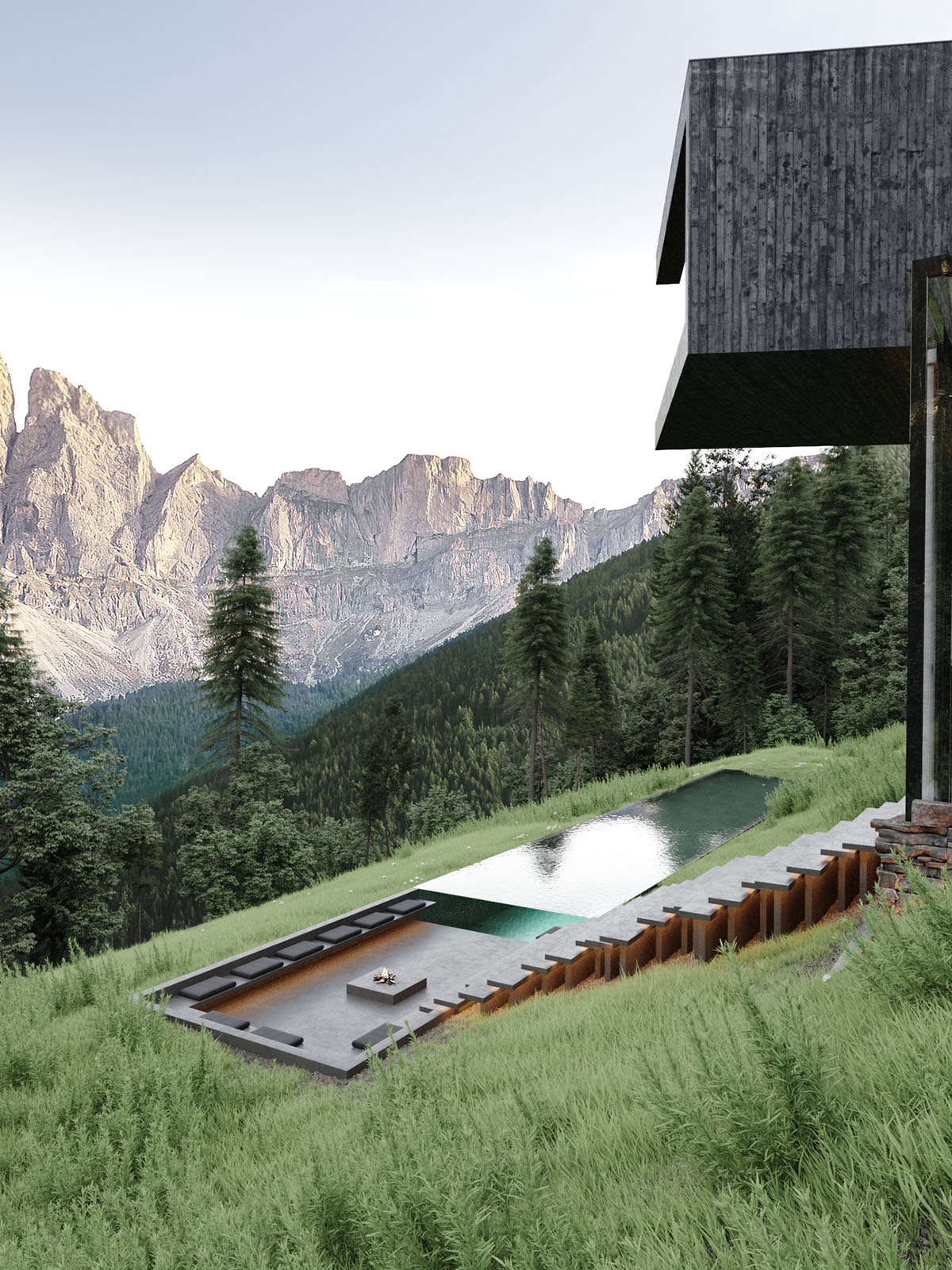 Una escalera exterior cálidamente iluminada serpentea por la ladera de la montaña, donde se acerca a una zona de estar junto a la piscina.