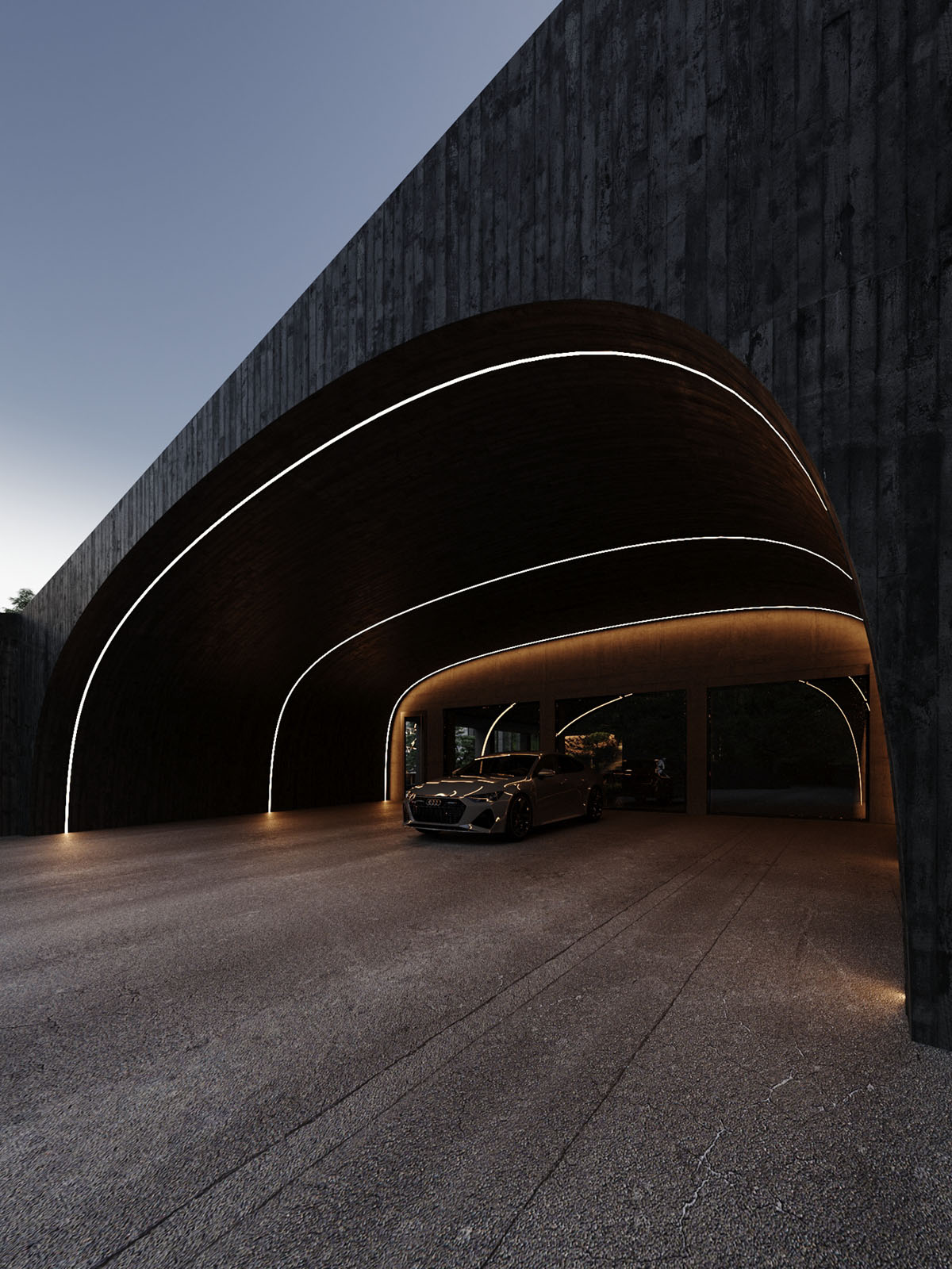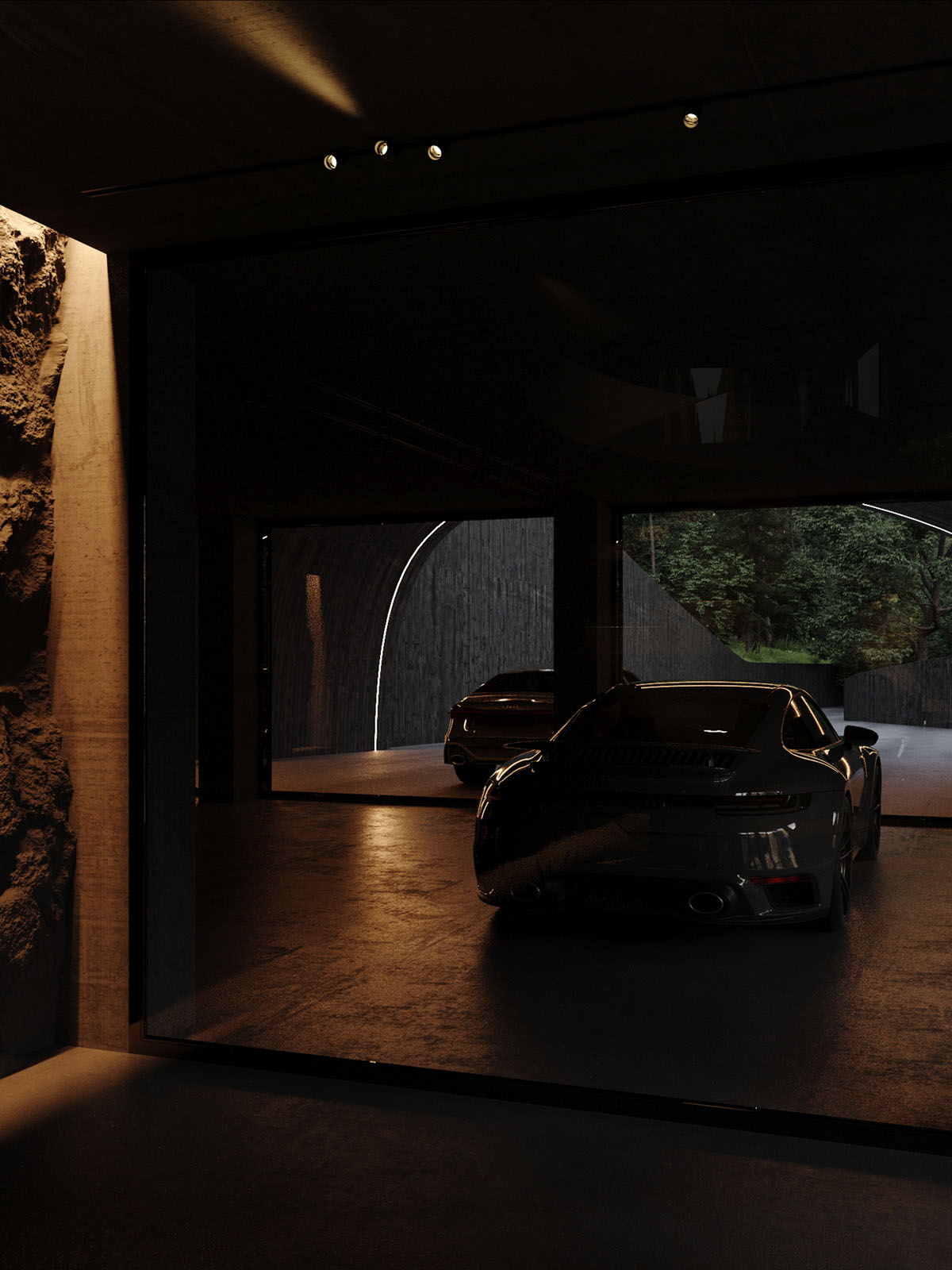 Unas brillantes cintas de luz blanca tienden un fenomenal puente de acceso al garaje, que se adentra en la montaña. El túnel parece la espectacular entrada a la guarida de un superhéroe.
