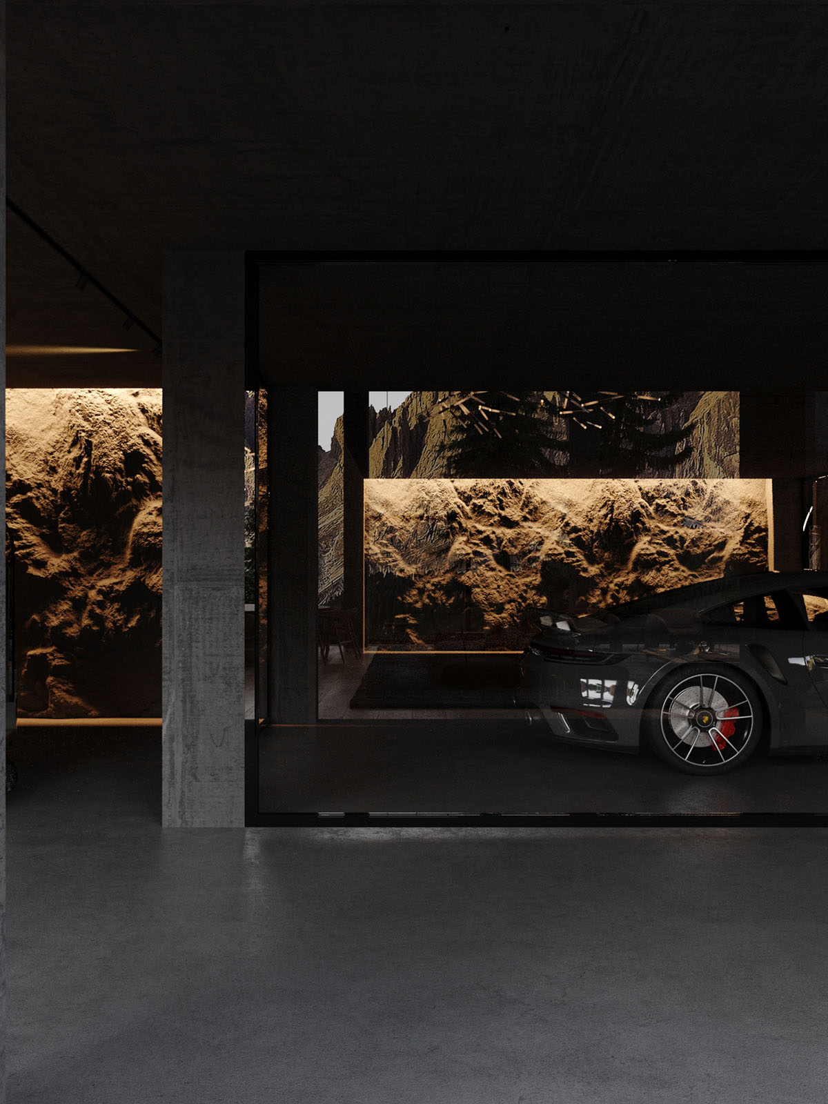 La superficie de roca desnuda es la única decoración necesaria para complementar la colección de vehículos de alta gama.