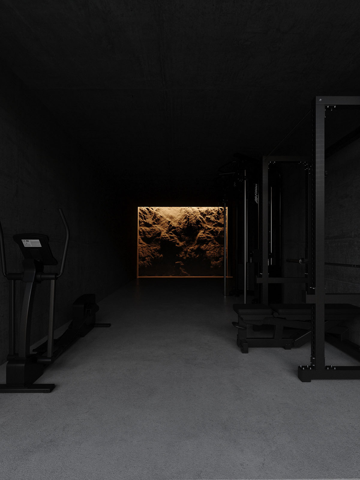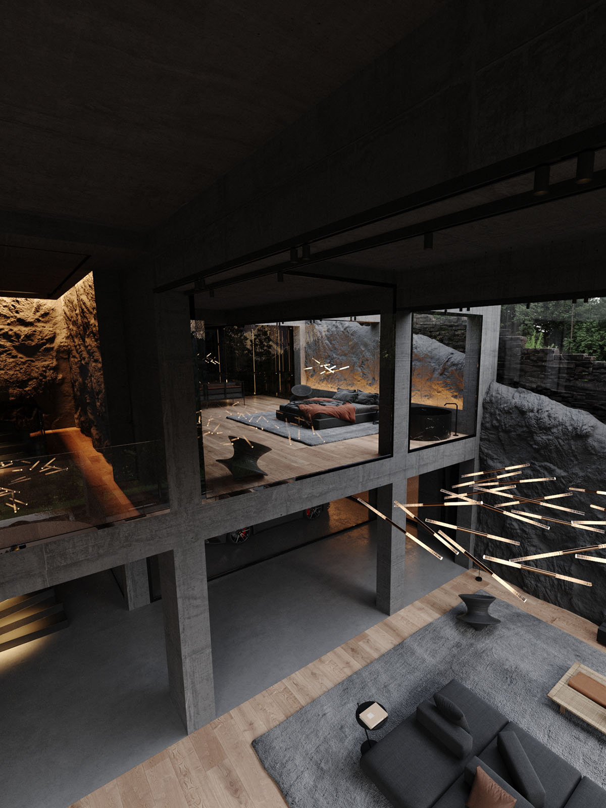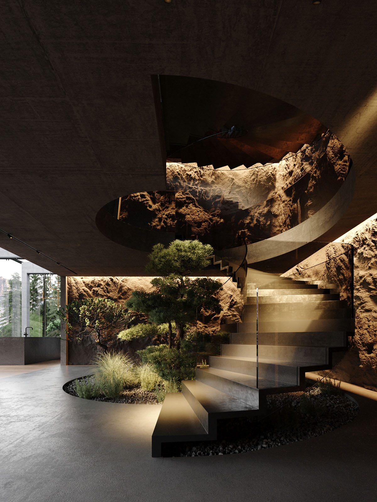 Una escalera de caracol serpentea por la montaña rocosa hasta llegar a otro patio más pequeño. Las luces LED del perímetro proyectan un resplandor atmosférico por la superficie rocosa de textura profunda, creando un drama visual.