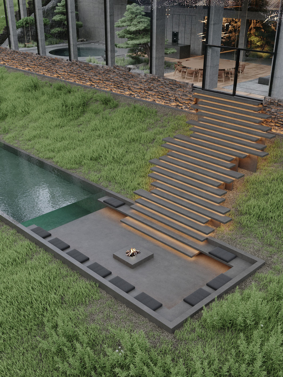 La enorme zona de conversación se calienta con una hoguera en el centro. La piscina se extiende desde la zona social exterior, abarcando todo el ancho de la casa.