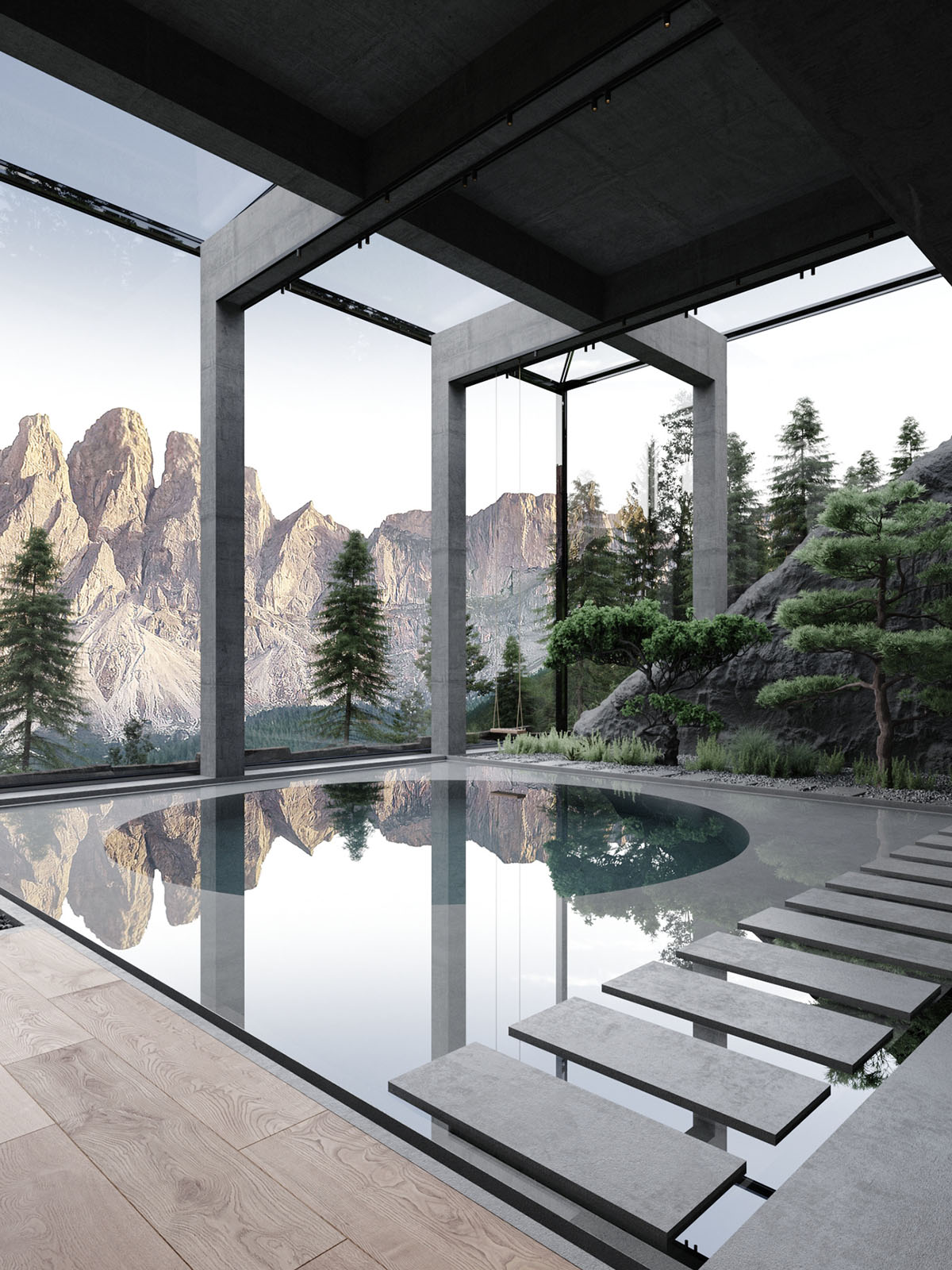 De vuelta a la sala de estar principal, visitamos una piscina de reflexión junto a la cocina y el patio. Una piscina circular más profunda se sumerge en su centro. Un camino de piedras rodea el borde del agua.