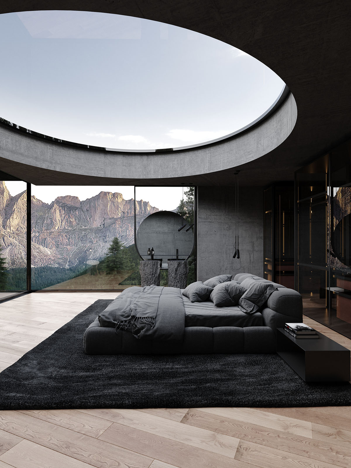 El segundo dormitorio cuenta con una enorme claraboya redonda que enmarca la luna.