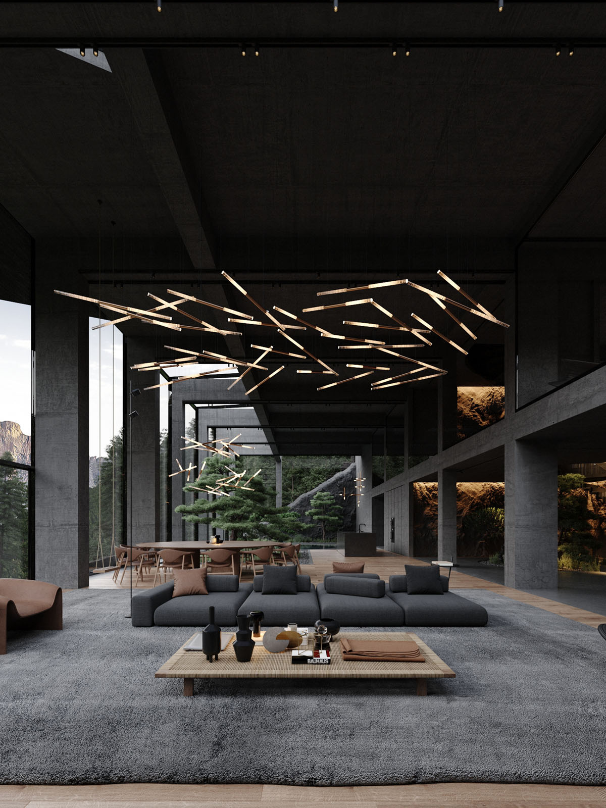 Un denso grupo de lámparas colgantes forma una instalación artística sobre el salón, creando un efecto hipnótico.