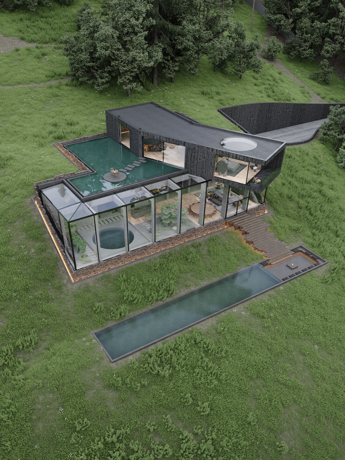 Las masas de agua definen la casa, creando un estanque de reflexión en el salón principal, una terraza en la azotea llena de agua y una piscina exterior que fluye hacia un acogedor pozo de conversación.